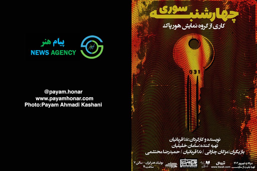 به گزارش پایگاه خبری و هنری پیام هنر، نمایش «چهارشنبه سوری» به نویسندگی و به کارگردانی: ندا قربانیان، به تهیه کنندگی: سامان خلیلیان و با بازی مژگان چارانی، ندا قربانیان و حمیدرضا محتشمی؛از تاریخ از ۲۶ مرداد تا ۰۵ شهریورماه سال جاری به مدت ۵۵ دقیقه و در ساعت ۱۹:۰۰ در بوتیک هنر ایران به روی صحنه رفت.