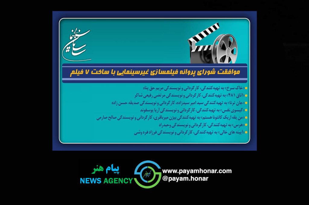 به گزارش پایگاه خبری و هنری پیام هنر و به نقل از اداره‌کل روابط عمومی سازمان سینمایی، فیلم‌نامه‌های مستند «خاک سرخ» به تهیه‌کنندگی، کارگردانی و نویسندگی مریم حق پناه، «جان ترنا» به تهیه‌کنندگی سید امیر سیدزاده،  کارگردانی و نویسندگی صدیقه حسن‌زاده، «آیینه‌های خالی» به تهیه‌کنندگی، کارگردانی و نویسندگی فرزاد فره‌وشی، نیمه بلند داستانی «اتاق ۴۸۱» به تهیه‌کنندگی، کارگردانی و نویسندگی مرتضی رفیعی شاکر، بلند داستانی «گیسوی نفس» به تهیه‌کنندگی، کارگردانی و نویسندگی آریا یوسفوند، «من یقه اریک کانتونا هستم» به تهیه‌کنندگی بیژن میرباقری، کارگردانی و نویسندگی  صالح صارمی  و کوتاه داستانی «هرس» به تهیه‌کنندگی، کارگردانی و نویسندگی وحید راد موافقت شورای پروانه فیلمسازی غیرسینمایی را اخذ کردند.