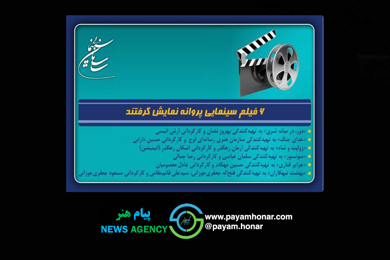 به گزارش پایگاه خبری و هنری پیام هنر و به نقل از ادارهکل روابط عمومی سازمان سینمایی، فیلمهای «خدای جنگ» به تهیهکنندگی سازمان هنری رسانه ای اوج و کارگردانی حسین دارابی، «سونسوز» به تهیهکنندگی سلمان عباسی و کارگردانی رضا جمالی، «جزایر قناری» به تهیهکنندگی حسین مهکام و کارگردانی عادل معصومیان، «بهشت تبهکاران» به تهیهکنندگی فتحاله جعفری جوزانی و سیدعلی قائم مقامی و کارگردانی مسعود جعفری جوزانی ،«دور، در میانه شرق» به تهیهکنندگی بهروز نشان و کارگردانی آرش انیسی و انیمیشن «ژولیت و شاه» به تهیهکنندگی آرمان رهگذر و کارگردانی اشکان رهگذر موافقت شورای پروانه نمایش فیلمهای سینمایی را کسب کردند.